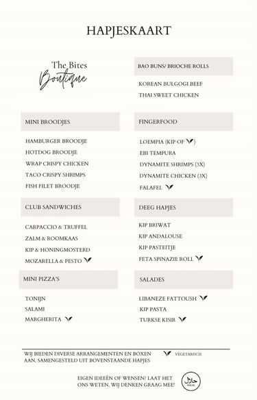 Of je nu kiest voor een volledig verzorgde bites table of een hapjesbox op maat — bij The Bites Boutique draait het om kwaliteit, creativiteit en zorg. Zien wat wij voor jouw gelegenheid kunnen betekenen? We helpen je graag verder.