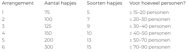We bieden zes arrangementen, geschikt voor 15 tot 90 personen. Elk arrangement bevat een gevarieerde selectie hapjes, die je zelf kiest uit onze hapjeskaart die je onderaan deze pagina kan vinden.